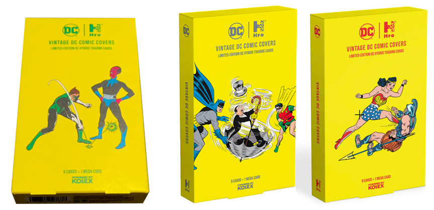 5. Vintage DC Comic Covers (July 2024). Set of 18 + 3 Mega. A pack contained 9 cards + 1 Mega card. "Limited quantities" were available exclusively on Hro's website for $35. Four different package variants. Allegedly, when they shut down the company said it would destroy any unsold packs; potentially rare because of this. Indeed they do not come up at auction very frequently.