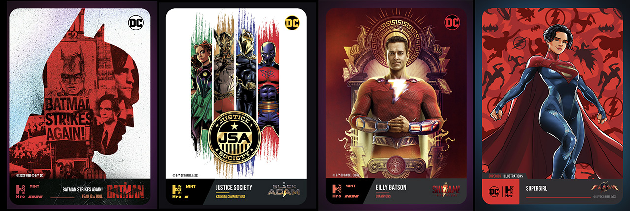Cards from the film subsets bear a slightly different design. From Chapters 1-4, The Batman, Black Adam, Shazam: Fury of the Gods and The Flash.