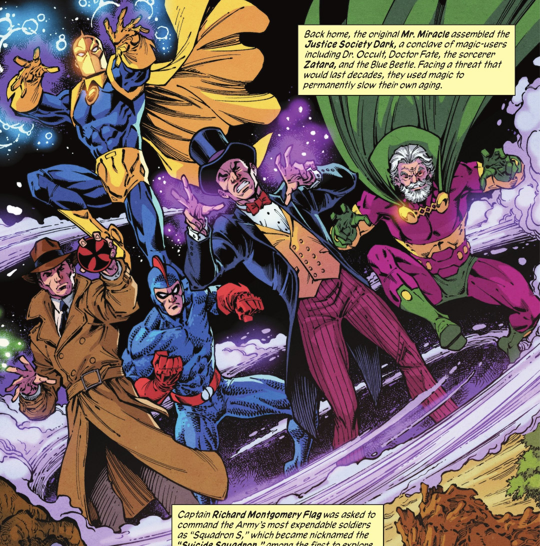 The Justice Society Dark, a World War II-era offshoot of the Justice Society of America. It was assembled by the original Mister Miracle (Thaddeus Brown) with Doctor Fate, Zatara, Doctor Occult and Blue Beetle. (New History of the DC Universe #1)