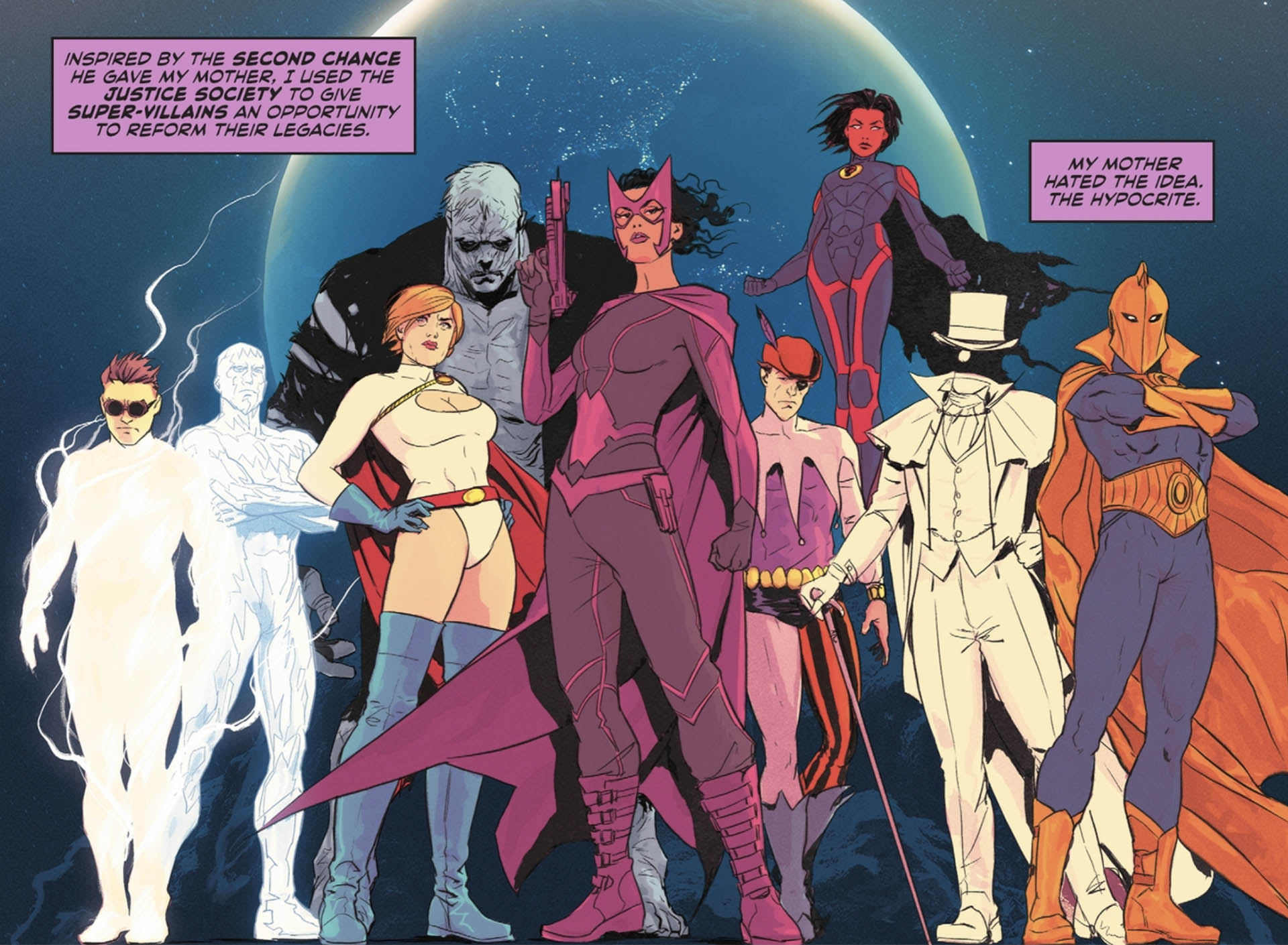 26 years in the future, the Huntress (daughter of Batman and Catwoman) is forced to assemble a Society made of reformed villains, her "Redeemers." (The New Golden Age #1, Jan. 2023)