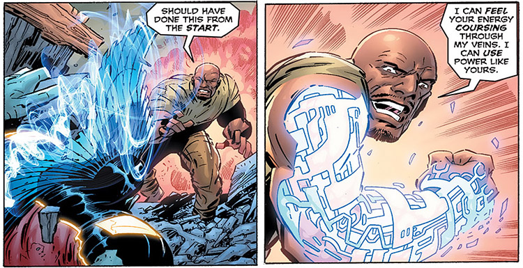 His powers sometimes frightened Will and they sometimes fluctuated. (#3) He worked with Blue Beetle to test their limits and found that there were virtually none. Unlike the way he mimicked material substances, with energy he could absorb and store even the most powerful forces, including those from Captain Atom and Firestorm. (#4)