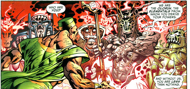 Meeting the Olorun. From Justice Society of America 80-Page Giant #1 (2010); art by Roberto Castro and John Floyd.