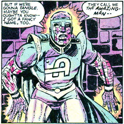 itself. His first task was to steal Dr. Fate's Helm of Nabu from within Fate's tower. Dr. Fate and the Atom bested Amazing-Man and they used a magical orb to learn his story. (All-Star Squadron #23)
