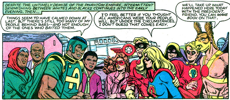 The All-Star Squadron learned from newsreels that the Ku Klux Klan (Nazi agents) were terrorizing black communities in Detroit. In the footage they saw none other than Will Everett fighting for his life. This formation of the Klan was called the Phantom Empire and led by the Real American. Even the white population was under their thrall. (#38) Amazing-Man discovered that the Real American had super-powers of his own and the Squadron looked only helplessly as Will was arrested for allegedly killing a white man. (#39) Both Will's father Jake and fiancé, Rachel Lindsay, cursed the heroes for standing idle. The Real American's activities soon crossed all legal boundaries and the All-Stars decided to free Will from jail. He broke the Real American—literally—and revealed him as an android fitted with some sort of persuasive voice technology (provided by the Monitor). The heroes found its operator, the Phantom Empire's Emperor. Will surprised everyone by agreeing to join the All-Star Squadron. (#40)