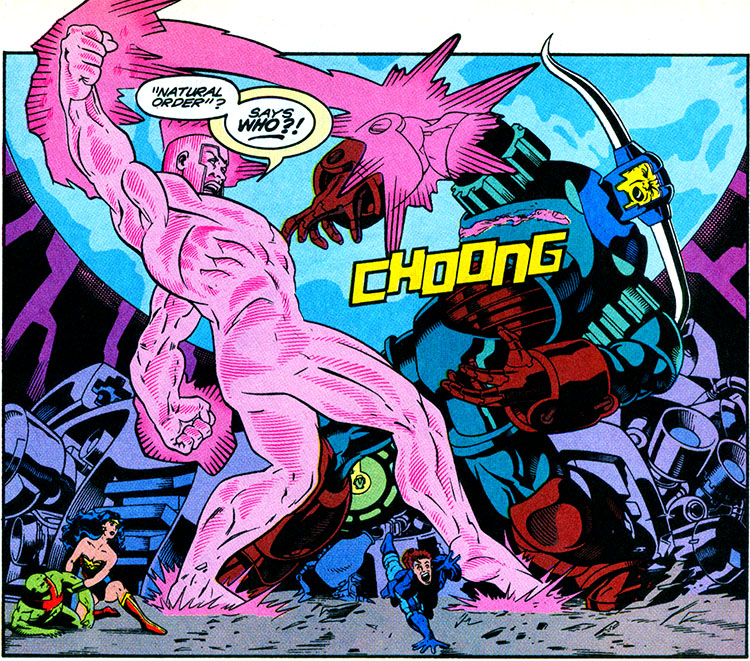 Markus was drawn into the JSA's confrontation with a Fourth World god called Gog. On the surface, Gog claimed to be altruistic and performed numerous "miracles" in Africa (where he'd been awakened). Although Gog's motives were suspect, Amazing-Man couldn't deny that eliminating militant overlords might be a good thing for the local population. (#18)