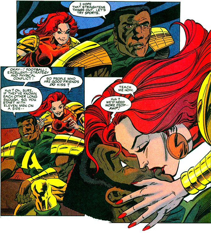 Will's body responded by putting on muscle mass, which did not go unnoticed by his teammate Maxima. (#10) Will accused of her of having certain fantasies about him—related to his race—which she denied. She explained that her people had long since become racially homogeneous and yes, she was attracted to his unfamiliar coloring. (#12) Soon enough they found themselves testing their intimacy. While watching TV, the two happened upon a sex scene. Maxima knew nothing of physical love because her people had distilled procreation to a scientific act. She impulsively initiated their first kiss. (#16) Their romance probably stalled because Captain Atom's team was soon dissolved and both left the JLA. (#18)