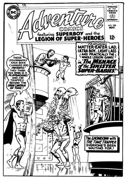 … because of the unusual effects of a chemical spray, the Hourglass of Evolution Doom only partially effected The Legionnaires exposed to its force. Instead of being reverted to blobs, their rapid de-aging halted at infancy. Their power remained intact and they were subsequently kidnapped by The Time Trapper and Glorith since they were at such a trusting and innocent age. The Trapper hoped to keep their confidence while their mental facilities were at their lowest. Luckily, Saturn Girl's extra sensory powers were not dimmed in the least and she easily sensed the evil of The Trapper.