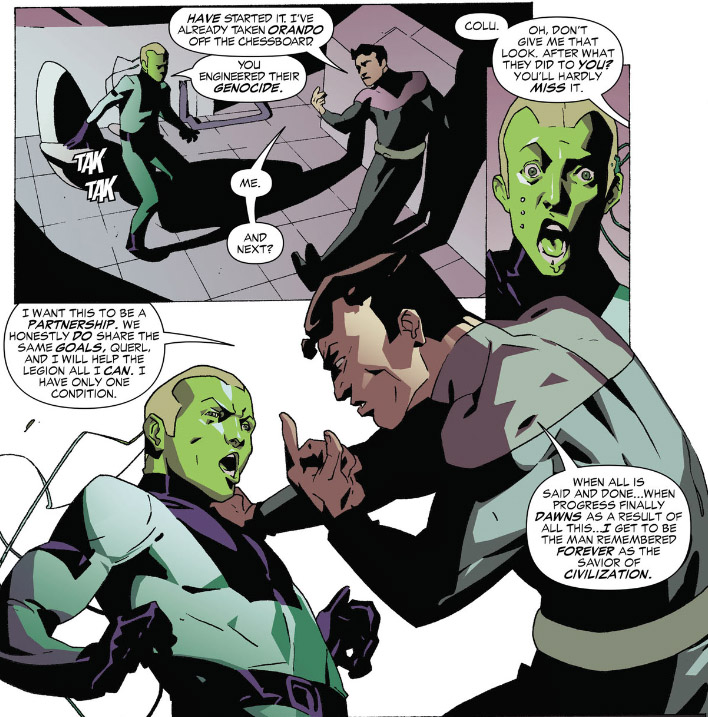 Their next attack was far more successful—and brutal. They destroyed the entire world of Orando, home of the Legionnaire Princess Projectra. Meanwhile Lemnos revealed himself to Brainiac 5 and reveals his power is to corrupt memory and has been manipulating forces against the Legion. Although Lemnos removed his memories of their meeting, a part of Brainy's mind would eventually recall it. (#6)
