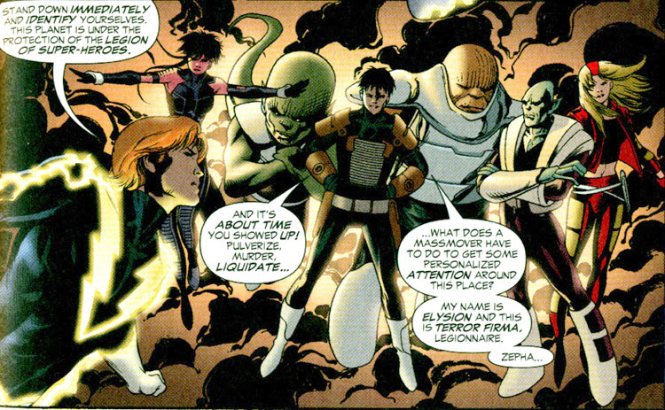 In their final offensive, the Legion discovered that Lemnos' forces were immense and numbered in the thousands. (#11) Another segment of "chosen" soldiers (including Terror Firma) numberd in the dozens. Legion turned the tables by seizing control of Terror Firma's transmatter gates and bringing down Elysion (by Atom Girl, who ventured inside his body then grew larger, and ripped him apart). (#12)
